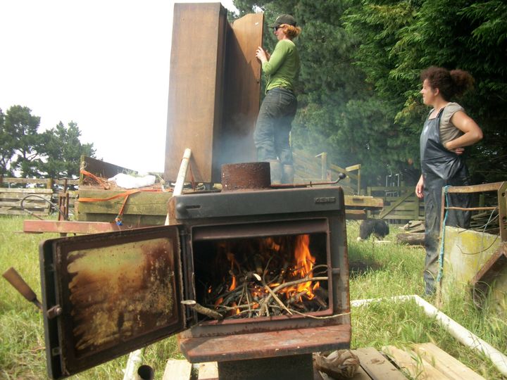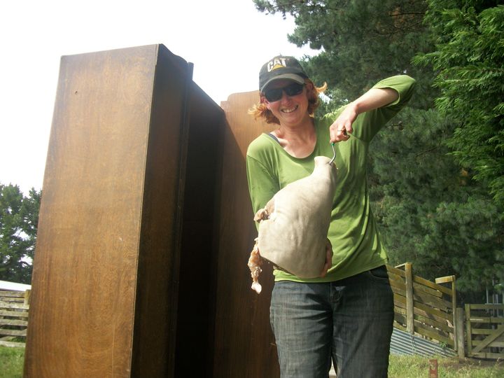 On a donc partagé et on l'a aidée dans son quotidien, un peu de rangement et de ménage pour préparer la maison (30 personnes à Noël), un peu de cuisine, de peinture par-ci par-là, de tonte d'herbe, de désherbage manuel des chardons, et on a même fumé le jambon-test avant le vrai de Noël ! Là encore, les kiwis sont les champions de la récup et de la débrouille : un poêle à bois, une gouttière en zinc et une vieille armoire, ça fera un fumoir. Pour info, on peut le laisser « enfumé » 1 jour ou une semaine, ça dépend comment on l'aime fumé !