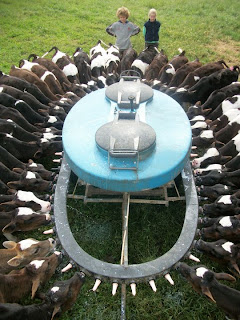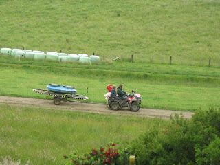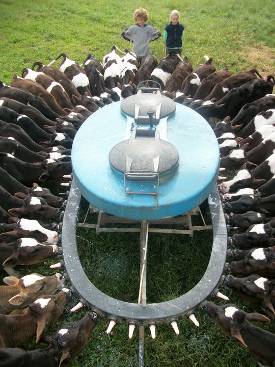 - descendre le chemin avec le quad et la « calfeteria » (calf = veau en anglais) pour donner le lait aux plus petits veaux, ceux qui faisaient moins de 80 kgs ; ils étaient à peu près 70 et ils buvaient 400 litres de lait tous les matins.